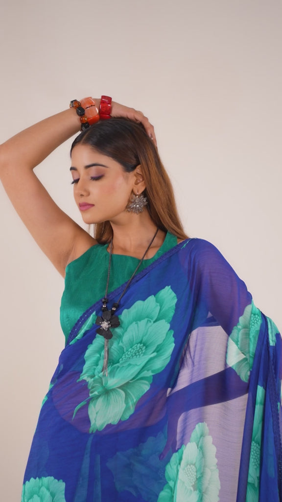 Each saree features vibrant, oversized floral patterns πΉ that add a touch of sophistication and charm.