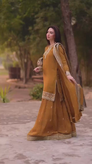A premium 3-piece ethnic set crafted in mul chanderi, designed to offer a refined and comfortable look. Featuring thread with sequnce work across the top, plazo, and dupatta, this ensemble delivers a graceful and versatile style suitable for festive, formal, and everyday occasions.