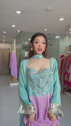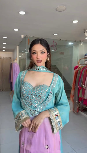 A stunning designer dress set crafted in premium Chinon silk, featuring real mirror embroidery work for a rich festive look. This 3-piece set includes a stitched top, matching palazzo, and elegant dupatta—perfectly blending glamour, comfort, and exceptional quality.