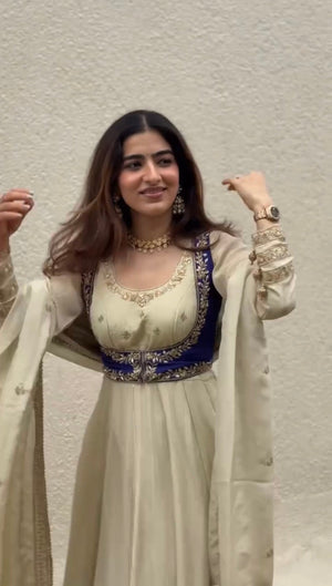 Designer Chinon Silk Gown Set with Embroidered Koti, Pant & Dupatta