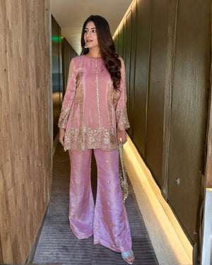 Step into effortless elegance with our Premium Chinon Silk Embroidered Top–Palazzo Set, designed for women who love comfort without compromising on glamour. Crafted using high-quality Chinon Silk, this outfit features rich sequins embroidery, a perfect fit, and a luxurious festive look.