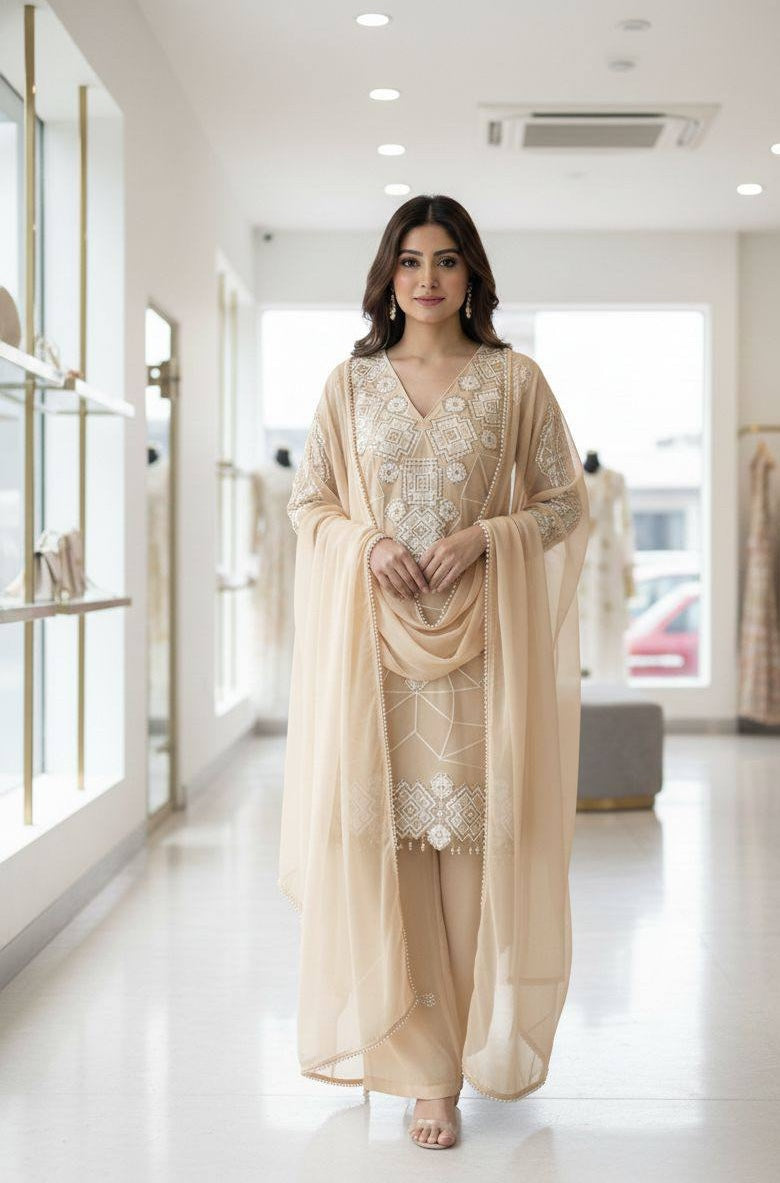 A trendy and elegant 3-piece festive set designed specially for wedding season and Eid celebrations. Made in flowy georgette fabric with beautiful sequence embroidery work, this outfit comes with a stylish top, comfortable plazzo, and a matching dupatta finished with lace border and tassels for a graceful ethnic look.