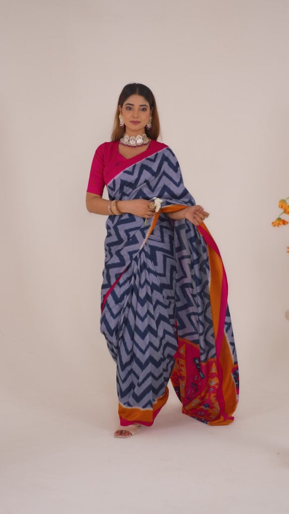 💫The saree features a striking zigzag pattern woven across the body, creating a bold contemporary statement while preserving the classic beauty of silk.✨