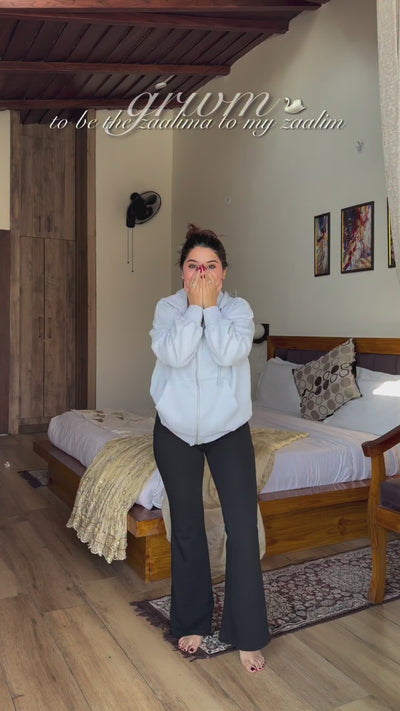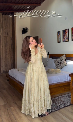 A stunning ready-to-wear 3-piece gown set crafted in pure chinon silk, beautifully enhanced with 5mm embroidery sequins work and elegant ravet moti detailing. Designed with full sleeves and attached latkan dori for a rich festive look, paired with a comfortable micro silk pant and matching embroidered dupatta for a complete graceful outfit.