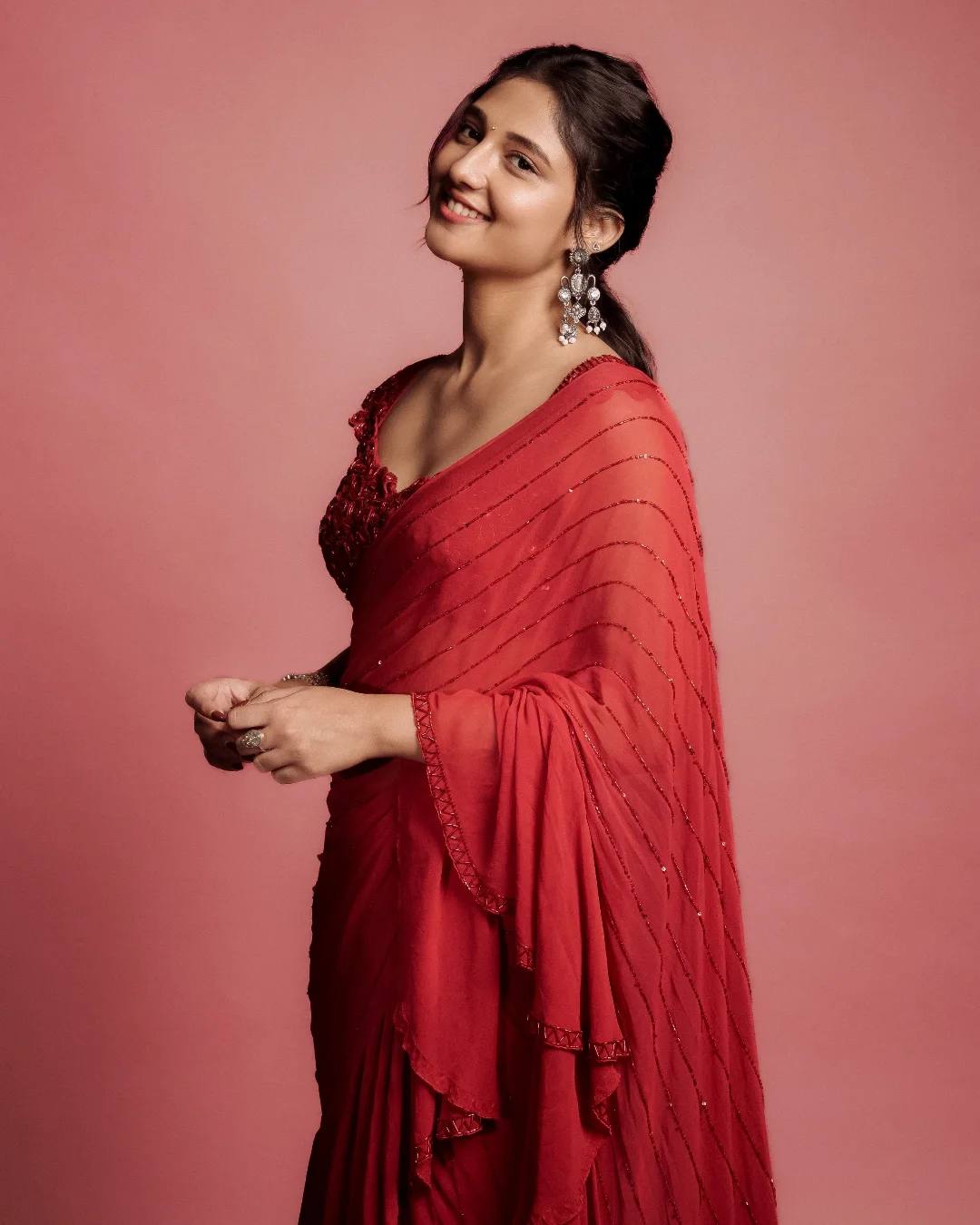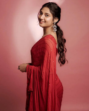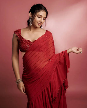 Make a bold statement with this stunning Bollywood-inspired ruffled saree in a rich solid red shade. Designed in premium faux georgette, this saree features elegant beads and sequins stripe embellishment with a glamorous 3-layer ruffle skirt and stylish ruffle pallu. Paired with a fully stitched designer blouse, this outfit is perfect for parties, weddings, and festive functions.